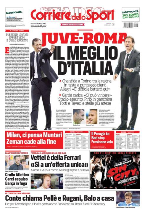 Corriere dello Sport- Juve-Roma il meglio d’Italia. Che sfida a Torino fra le regine in testa a punteggio pieno. Allegri: “E’ difficile batterci qui”. Garcia carica: “Si può vincere”. Stadio esaurito. Pirlo in panchina. Totti e Tevez le stelle più attese. Milan, ci pensa Muntari. Zeman cade alla fine.