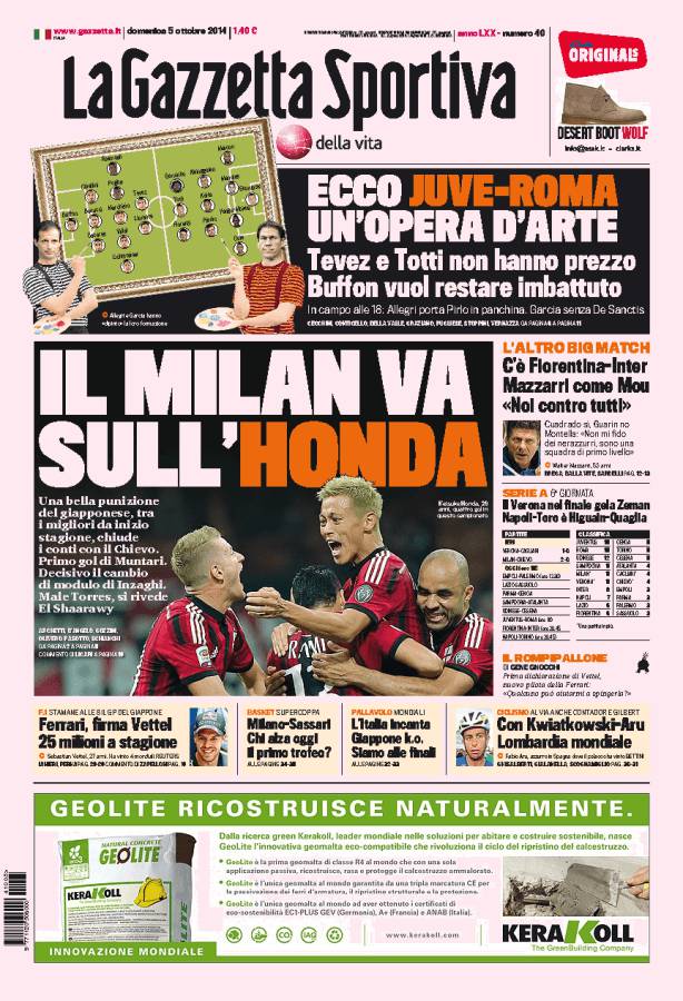 Gazzetta dello Sport- Il Milan va sull’Honda. Una bella punizione del giapponese fra i migliori da inizio stagione, chiude i conti con il Chievo. Primo gol di Muntari. Ecco Juve-Roma, un’opera d’arte. Tevez e Totti non hanno prezzo. Buffon vuol restare imbattuto. Mazzarri come Mourinho: “Noi contro tutti”.