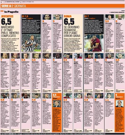 Ancora una volta Juventus e Roma danno vita a un grande spettacolo in campo in termini qualitativi ma danno spunto a mille polemiche per un arbitraggio, quello di Rocchi, assolutamente inadeguato. L’arbitro fiorentino sbaglia in molte occasioni e la Gazzetta dello Sport lo boccia inesorabilmente con un 4 in pagella. Tornando a parlare della gara dei singoli giocatori, sugli scudi Carlos Tevez che ha siglato una doppietta su rigore, il migliore della Juventus. Nella Roma invece perentoria la prestazione di Keita vero e proprio maestro dell’orchestra giallorossa. Voti e pagelle della Gazzetta dello Sport.