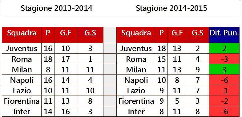 A confronto l’andamento di questa stagione con quella scorsa delle big del nostro calcio. Dopo sei giornate la Juventus comanda a punteggio pieno, forte del successo sulla Roma di ieri sera. I bianconeri migliorano rispetto ad un anno fa con 2 punti in più come bottino. La Roma invece vede diminuire la striscia di vittorie consecutive della passata stagione, tanto che la sconfitta allo Juventus Stadium costa 3 punti in meno. Bruttissima partenza per Napoli ed Inter che fanno registrare un meno 6 che mette in bilico il futuro dei rispettivi allenatori. Stabile la Lazio, che perde solo un punto nel confronto con il campionato scorso, mentre la Fiorentinane perde 2. Buona invece la partenza del Milan: i rossoneri guadagnano 3punti.