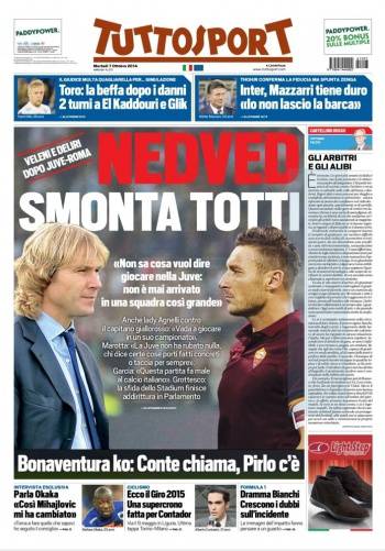 Tuttosport parla delle parole di Nedved durissime su Totti durante il programma di Mediaset Tiki Taka. La polemica tra Juventus e Roma non è ancora finita.