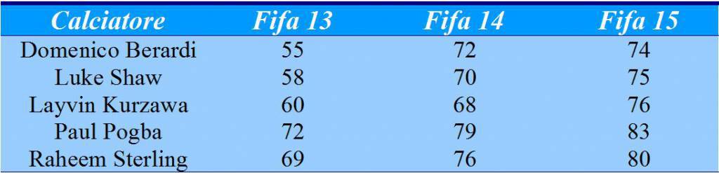 Prosegue il viaggio di CalciomercatoNews.com alla scoperta dei calciatori più interessanti su Fifa 15, noto titolo videoludico della EA Sports che tiene, ormai da più di un decennio, tantissimi gamers incollati a console e PC. Vi avevamo parlato nella scorsa settimana dei calciatori crollati improvvisamente, a livello di valori, da Fifa 13 a Fifa 15. Oggi facciamo invece il percorso inverso: analizziamo i valori dei calciatori che, nelle ultime tre edizioni del famoso videogioco, sono impennati, trasformando i giovani talenti in veri e propri fenomeni. In classifica troviamo esclusivamente, e non poteva essere altrimenti, giovani diventati fenomeni negli ultimi anni come Paul Pogba, Domenico Berardi o Raheem Sterling. Certo che comunque notare l’impennata di un italianissimo Berardi ad esempio, passato da 55 di Overall a 74 nel giro di tre edizioni, lascia davvero senza parole. Ecco la grafica: