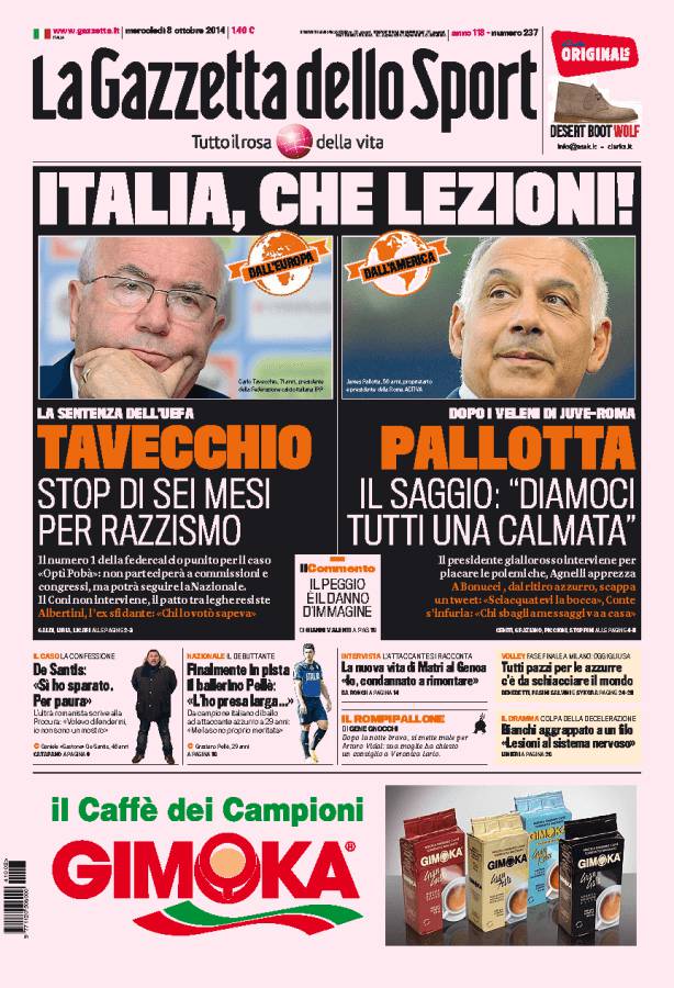 La Gazzetta dello Sport parla della squalifica per sei mesi inflitta dall’Uefa a Tavecchio per la famosa frase razzista e delle parole di Pallotta che ha voluto calmare gli animi dopo Juventus-Roma.