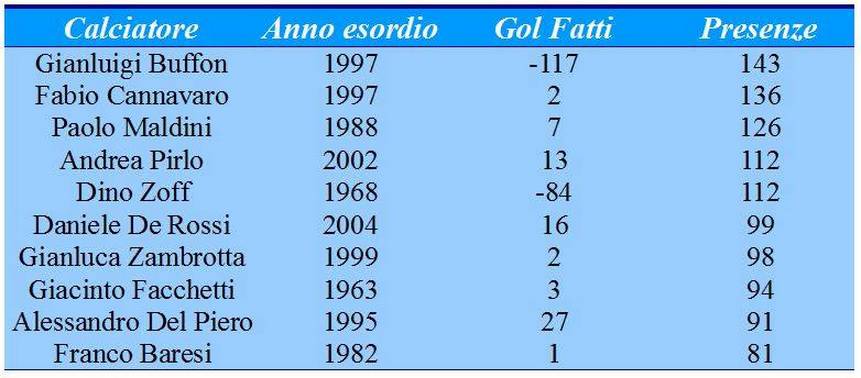 Durante la partita contro l’Azerbaigian in programma domani Andrea Pirlo, grazie al suo ritorno tra i convocati di Antonio Conte, potrebbe superare Dino Zoff nella speciale classifica delle presenze in nazionale. Il centrocampista infatti è fermo a quota 112 come l’ex portiere e potrebbe portarsi al quarto posto in solitaria a 113 dietro a Gianluigi Buffon (146), Fabio Cannavaro (136) e Paolo Maldini (126). La Top 10 è completata poi da Daniele De Rossi (99), Gianluca Zambrotta (98), Giacinto Facchetti (94), Alessandro Del Piero (91) e Franco Baresi (91). E’ immaginabile che Daniele De Rossi potrà raggiungere facilmente il podio nei prossimi anni avendo solo 31 anni ed essendo rimasto insieme al centrocampista della Juventus ed al capitano Buffon quello ad essere ancora in attività e con la possibilità di migliorare il proprio record.