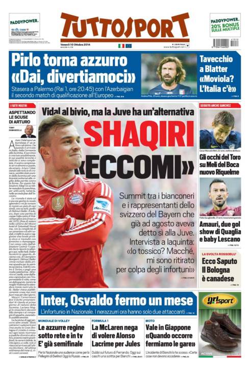Tuttosport – Shaqiri ‘Eccomi’ 10/10/2014 di Ruggieri Su Tuttosport si parla del talento svizzero del Bayern Monaco Shaqiri che potrebbe approdare alla Juventus in estate. Samuele Roccati