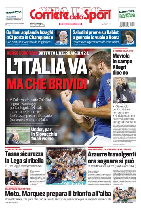 Anche il Corriere dello Sport parla della faticosa vittoria dell’Italia contro l’Azerbaigian in cui il protagonista assoluto è stato Chiellini.