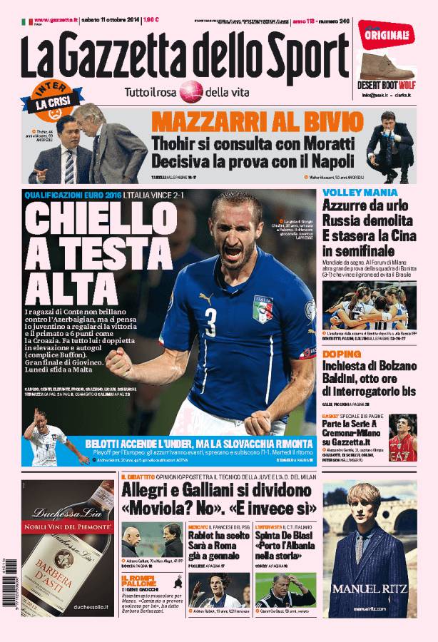Sulla Gazzetta dello Sport si parla di Chiellini vero e proprio protagonista contro l’Azerbaigian. Per lui doppietta e anche autogol nel due a uno finale.