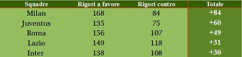 Dati inconfutabili che mettono in testa il Milan, distaccato di più di 20 penalty fischiati a favore rispetto alla Juventus, e con una media di +84 tra i rigori avuti ed i rigori fischiati contro.