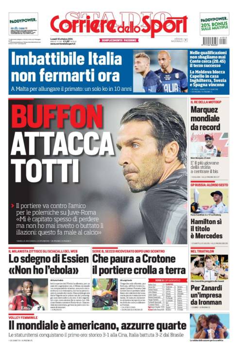 Sul Corriere dello Sport si parla di Buffon che ha attaccato Francesco Totti per le dichiarazioni fatte nel post Juventus-Roma.