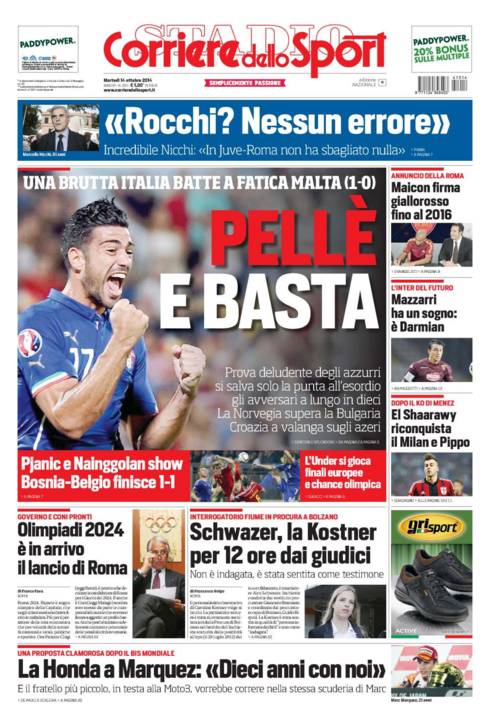 Il Corriere dello Sport parla dell’uno a zero dell’Italia contro Malta con il gol di Pellé, ma la squadra non è piaciuta.