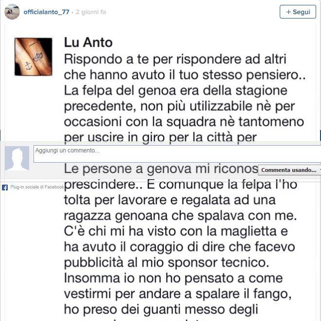 L’immagine di Luca Antonini che scende in strada per aiutare la popolazione di Genova in seguito all’alluvione, ha scatenato diverse reazioni. In molti, infatti, hanno criticato Antonini perché nella foto indossa una felpa con l’immagine del ‘Grifone’ con uno sponsor in bella vista. E così, Antonini, attraverso il suo profilo, ha risposto alle accuse: “La felpa era della stagione precedente e non utilizzabile né con la squadra né per uscire. Poi l’ho regalata ad una ragazza genoana che spalava con me. C’è chi mi ha visto con la maglietta e ha avuto il coraggio di dire che facevo pubblicità per il mio sponsor tecnico. Insomma io non ho pensato a come vestirmi per andare a spalare il fango. Ho preso dei guanti, messo degli scarponi e sono andato”.