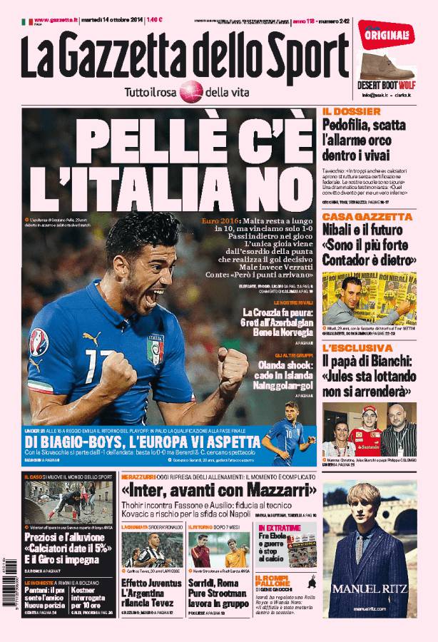 Gazzetta dello Sport – Pelle c’è, l’Italia no 14/10/2014 di Ruggieri La Gazzetta dello Sport parla dell’uno a zero dell’Italia contro Malta con il gol di Graziano Pellé. Passi indietro nel gioco per la formazione di Conte. Samuele Roccati