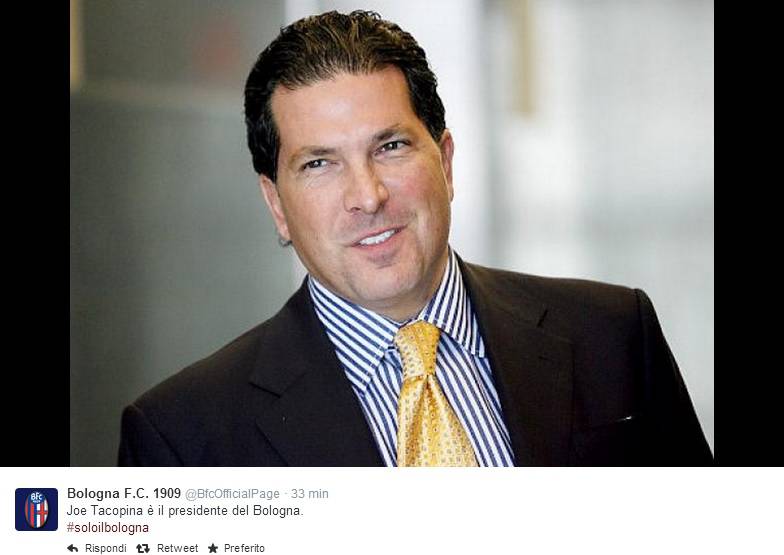 Joe Tacopina è il nuovo presidente del Bologna. L’annuncio ufficiale è stato dato sia sul sito del club rossoblu che sul profilo Twitter della società: “Alle ore 17:29 di oggi Bologna 2010 ha ceduto il pacchetto azionario di Bologna F.C. 1909 al gruppo americano guidato dall’avvocato Joe Tacopina. È stato di seguito nominato il nuovo consiglio di amministrazione che comprende Joe Tacopina Presidente, Luca Bergamini e Piergiorgio Bottai Consiglieri”. L’avvocato di New York è il trentesimo presidente della società emiliana e sarà affiancato in questa nuova avventura da Joey Saputo. Sempre più probabile l’inserimento nei quadri dirigenziali di Marco Di Vaio, che ha vissuto quattro anni da calciatore sotto le due torri.
