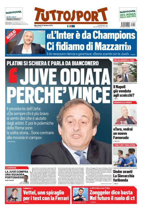 Su Tuttosport vengono riportate le parole di Platini, presidente Uefa, ex giocatore bianconero, che difende la squadra torinese dalle accuse dopo Juventus-Roma.