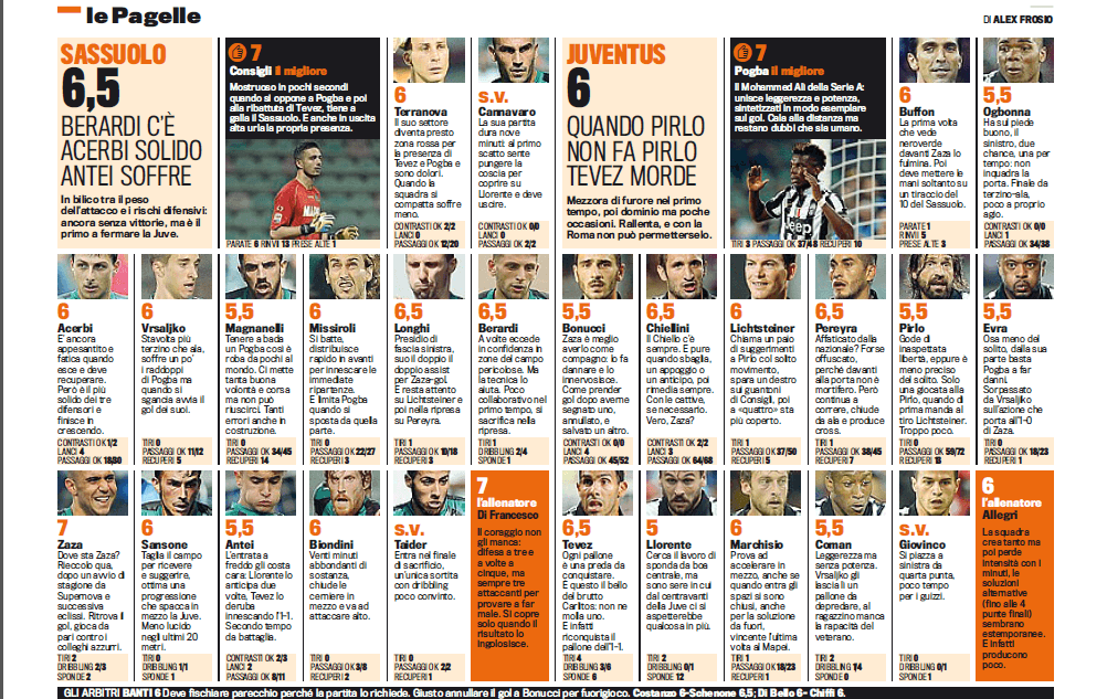 La Juventus non risponde alla vittoria della Roma e inciampa sul campo del Sassuolo dove raccoglie solo un pareggio. Alla reti di Zaza ha risposto Paul Pogba. In seguito un grandissimo Consigli ha evitato al Sassuolo di soccombere. I toscani, però, a loro volta, hanno avuto anche diverse occasione per il raddoppio. Nel complesso, nei voti della Gazzetta dello Sport, la squadra di Di Francesco merita mezzo punto in più. Per quanto riguarda gli uomini, nel Sassuolo, il migliore è stato sicuramente Consigli che ha evitato più volte alla Juventus di passare in vantaggio. Tra i bianconeri, invece, il migliore non può che essere Pogba. Per il resto poca Juve,