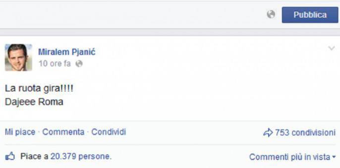 La Juventus pareggia in casa del Sassuolo e la Roma guadagna due punti sui bianconeri arrivando subito a -1. Senza perdere tempo, il centrocampista giallorosso Miralem Pjanic, posta un messaggio sul suo profilo Facebook che sembra indirizzato proprio alla squadra di Allegri: “La ruota gira”. In pochissimo tempo, il post del bosniaco ottiene migliaia di mi piace e più di 700 condivisioni. Dopo la vittoria dei giallorossi sul Chievo e il pareggio della Juventus, a Roma c’è grande entusiasmo. Come ha ammesso lo stesso Rudi Garcia, quest’anno l’obiettivo è la vittoria dello scudetto.