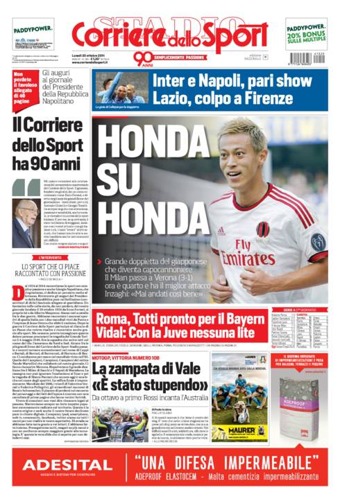 Il Corriere dello Sport parla del Milan che vince tre a uno a Verona con doppietta di Super Honda, capocannoniere del campionato.