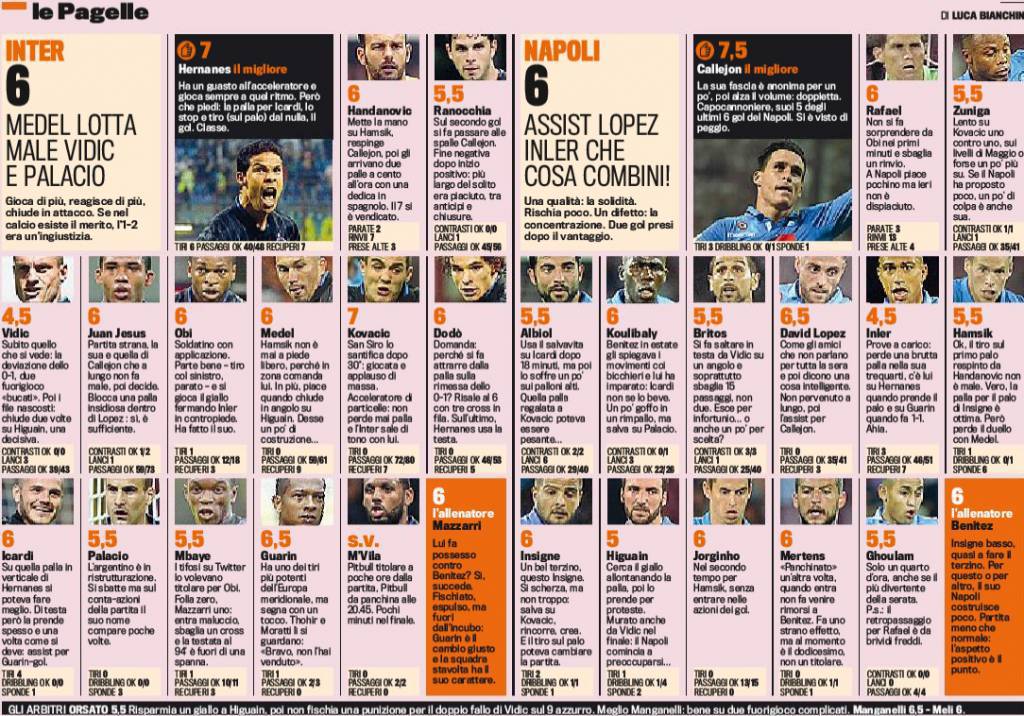 Finisce due a due a San Siro tra Inter e Napoli, un pareggio spettacolare che salva soprattutto la panchina di Walter Mazzarri. Succede tutto nel secondo tempo con il Napoli che passa in vantaggio con Callejon che approfitta di uno svarione difensivo dei nerazzurri, il pareggio immediato è di Guarin entrato poco prima per Medel. Ancora Callejon porta avanti il Napoli ma la rabbia nerazzurra porta al pareggio di Hernanes al novantesimo su assist di Dodò. Hernanes e Callejon migliori in campo, Vidic e Inler bocciati dalla Gazzetta dello Sport.