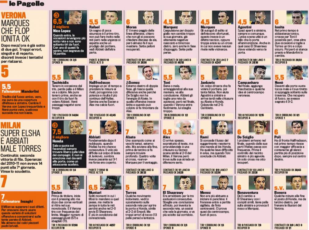 Altro che Fatal Verona, il Milan di Pippo Inzaghi supera in scioltezza l’ostacolo Bentegodi e passa con il punteggio di tre a uno sul Verona di Mandorlini. Partita che il Milan conduce fin dal primo minuto e passa in vantaggio grazie a una sciagurata autorete di Marques che beffa Rafael. Dopo sale in cattedra Keisuke Honda autore di una doppietta che lo proietta in testa alla classifica marcatori della Serie A: il giapponese è il migliore in campo per la Gazzetta dello Sport. Non convince ancora Torres, per lo spagnolo un’altra insufficienza.