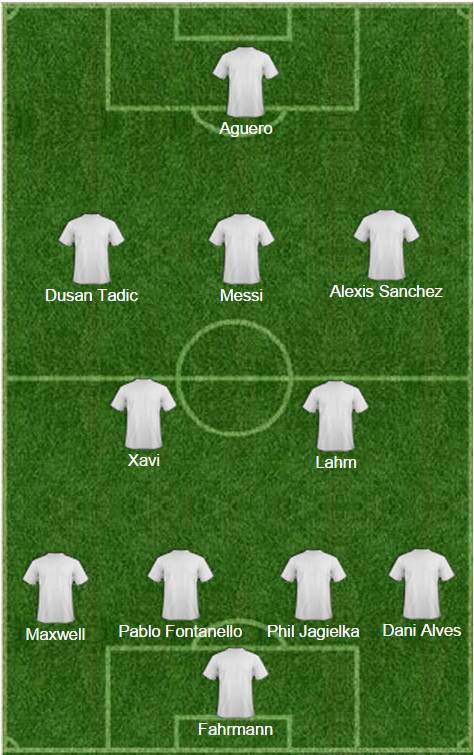 In porta Fahrmann, estremo difensore dello Shalke 04, che si è fatto notare contro l’Herta Berlino. In difesa Dani Alves, Jagielka dell’Everton, Fontanello e Maxwell. A centrocampo Xavi e Lahm, alla sua prima doppietta in carriera. Davantiil tridente formato da Tadic del Southampton, Messi e Sanchez a supporto dell’avanzato Aguero–
