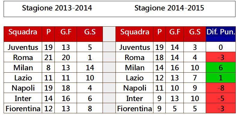 Prosegue il viaggio di Calciomercatonews.com: anche questa settimana, conclusa la settima giornata del campionato di Serie A, continuiamo a seguire il confronto tra le ultime due stagioni disputate dalle big del campionato italiano. La Juve, dopo il pareggio con il Sassuolo, raggiunge nuovamente il tetto dei 19 punti che, a questo punto della scorsa annata, aveva toccato. Sorprendente il balzo del Milan che colleziona 6 punti in più, mentre altrettanto bene fa la Lazio che, curiosamente, anche nella scorsa stagione, alla 7^, aveva affrontato la Fiorentina. Continua invece l’annata disastrosa di Napoli ed Inter: meno 8 e meno 5 punti rispetto a 12 mesi fa. Serve, necessariamente, un cambio di rotta…