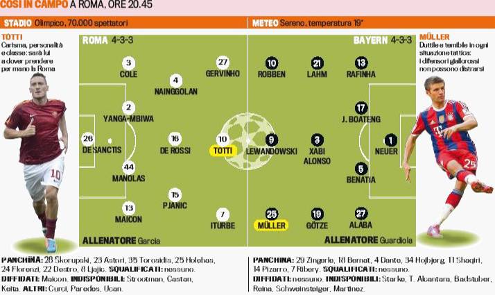 E’ finalmente arrivato il giorno tanto atteso della super sfida tra Roma e Bayern Monaco, match valido per la terza giornata di Champions League. All’Olimpico arriva il Bayern di Guardiola che ha intenzione di chiudere la pratica per il primo posto con tre giornate d’anticipo. La Roma di Garcia punterà sulla velocità di Iturbe e Gervinho e alla genialità di Totti: a centrocampo spazio a Nainggolan, De Rossi e Pjanic, mentre in difesa Yanga-Mbiwa ha vinto il ballotaggio con Astori e Cole quello contro Holebas. Nel Bayern Monaco ci sarà l’ex Benatia in difesa, Xabi Alonso regista del centrocampo e in attacco accanto a Lewandowski il duo Robben e Muller. Le probabili formazioni secondo la Gazzetta dello Sport.