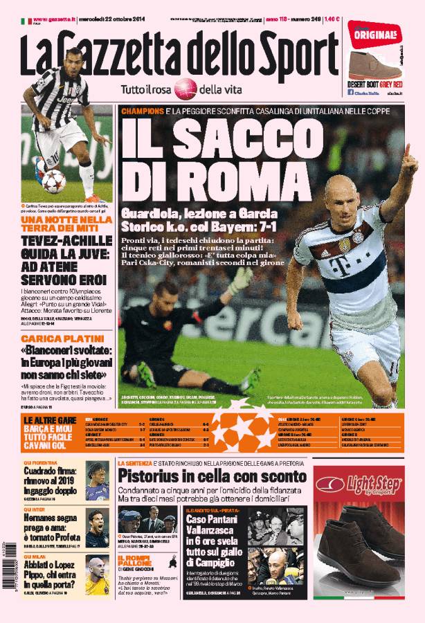 La Gazzetta dello Sport parla ovviamente della terribile sconfitta della Roma che in casa perde sette a uno contro il Bayern Monaco.