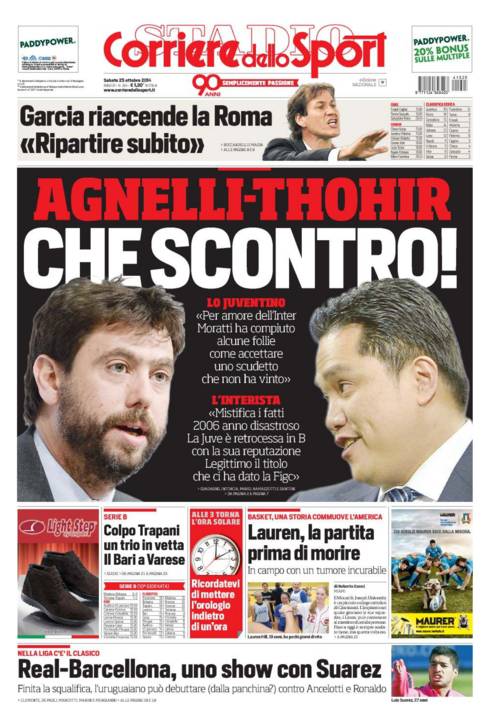 Anche il Corriere dello Sport apre con lo scontro tra Agnelli e Thohir, con il secondo che ha risposto al primo in maniera velenosa.