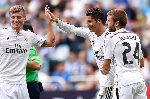 Real: Casillas, Pepe, Sergio Ramos, Marcelo, James Rodríguez, Modric, Kroos, Isco, Benzema, Cristiano Ronaldo