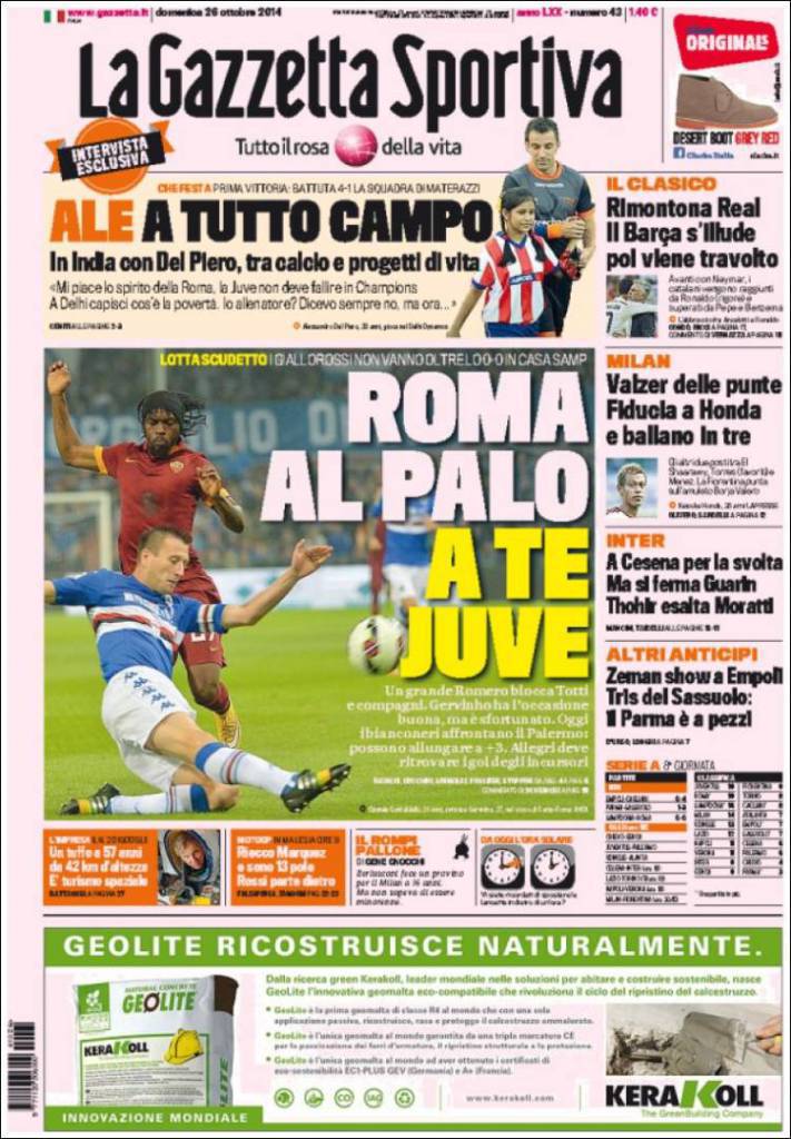 Un grande Romero blocca Totti e compagni. Gervinho ha l’occasione buona ma è sfortunato. Oggi i bianconeri affrontano il Palermo e possono allungare a +3. Rimontona Real: il Barca s’illude, poi viene travolto. Zeman show a Empoli. Tris del Sassuolo: il Parma è a pezzi.