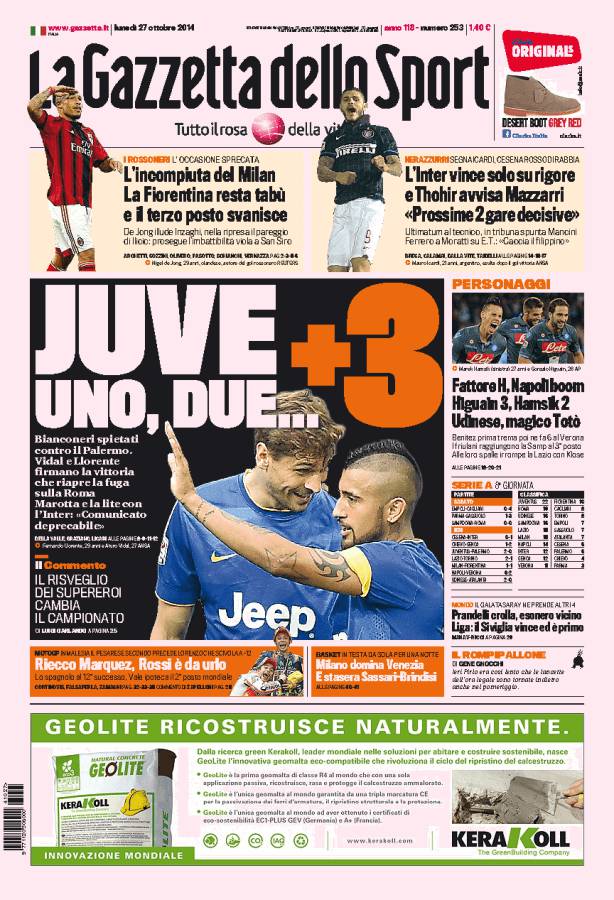 La Gazzetta dello Sport parla della Juventus che vola a più tre dalla Roma dopo la vittoria contro il Palermo per due a zero.