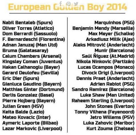 Sono stati rivelati i nomi dei 40 giocatori candidati al “Golden boy 2014“. Interessante lista dei giovani più interessanti nel calcio europeo nella quale ci sono due giocatori italiani come Berardi e Bernardeschi. La Serie A è poi rappresentata anche da Kovacic dell’Inter, Coman della Juventus e Keita della Lazio. Nessuna giocatore di Real Madrid e Manchester City nella lista, mentre non manca Rabiot del Psg oggetto del desiderio sul mercato di Juventus e Roma. Ecco l’elenco completo.