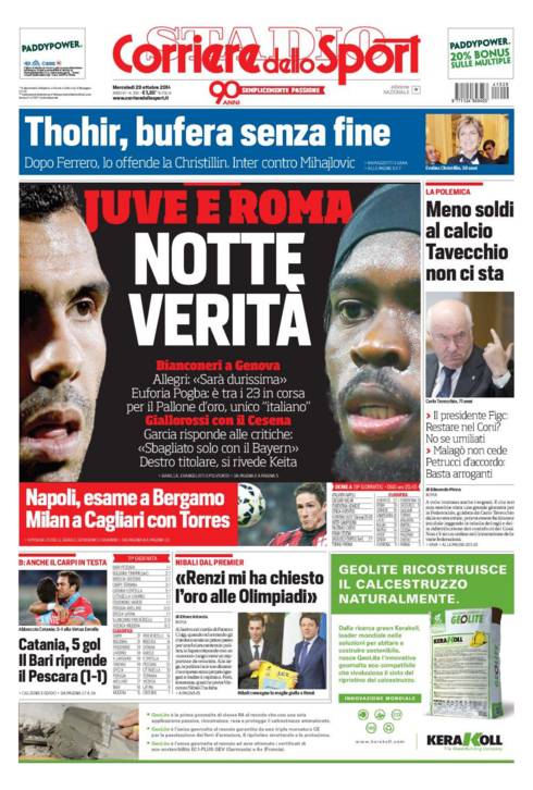 Il Corriere dello Sport parla invece degli impegni di questa sera di Juventus e Roma con i bianconeri pronti a giocare a Genova contro Gasperini, i giallorossi impegnati contro il Cesena in casa.