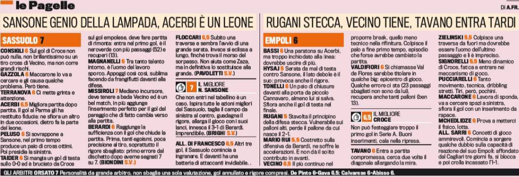 Il Sassuolo di Di Francesco dopo il tre a uno a Parma contro la formazione di Donadoni vince con lo stesso punteggio in casa contro l’Empoli. I padroni di casa reagiscono dopo il gol iniziale di Croce anche grazie a un Sansone ispirato come non mai. E’ lui a squarciare in due la difesa di Sarri che non tiene: in gol per il Sassuolo ci vanno Missiroli, Floccari e Berardi che sbaglia anche un calcio di rigore. Male Rugani nell’Empoli, il difensore che piace alla Juventus non riesce a bloccare l’offensiva del Sassuolo. Voti e pagelle della Gazzetta dello Sport.