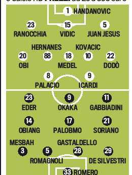 Questa sera a San Siro andrà di scena un match importante per la decima giornata di campionato. Di fronte ci saranno Inter e Sampdoria, una grande sfida soprattutto pensando al confronto in panchina tra Mazzarri e Mihajlovic, presente e potenziale futuro dell’Inter. Mazzarri ripropone Vidic al centro della difesa, con lui Juan Jesus e Ranocchia, fuori Campagnaro: novità a destra con Obi schierato sulla fascia, dall’altra parte conferma per Dodò. La Sampdoria non cambia modulo, attacco a tre con Eder-Okaka-Gabbiadini, il tecnico serbo se la vuole giocare fino alla fine. Le probabili formazioni secondo la Gazzetta dello Sport.