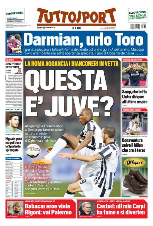 Tuttosport parla della sconfitta della Juventus al Marassi per uno a zero e critica il gioco della squadra di Allegri.