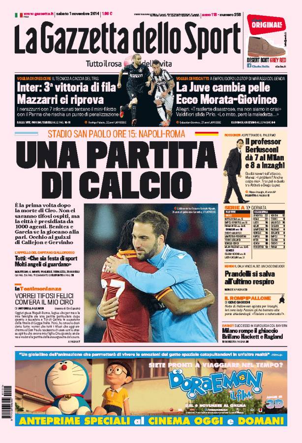 La Gazzetta dello Sport si augura che quest’oggi, alle ore 15 al San Paolo, Napoli-Roma diano vita a una semplice partita di calcio senza nessuno scontro tra tifosi.