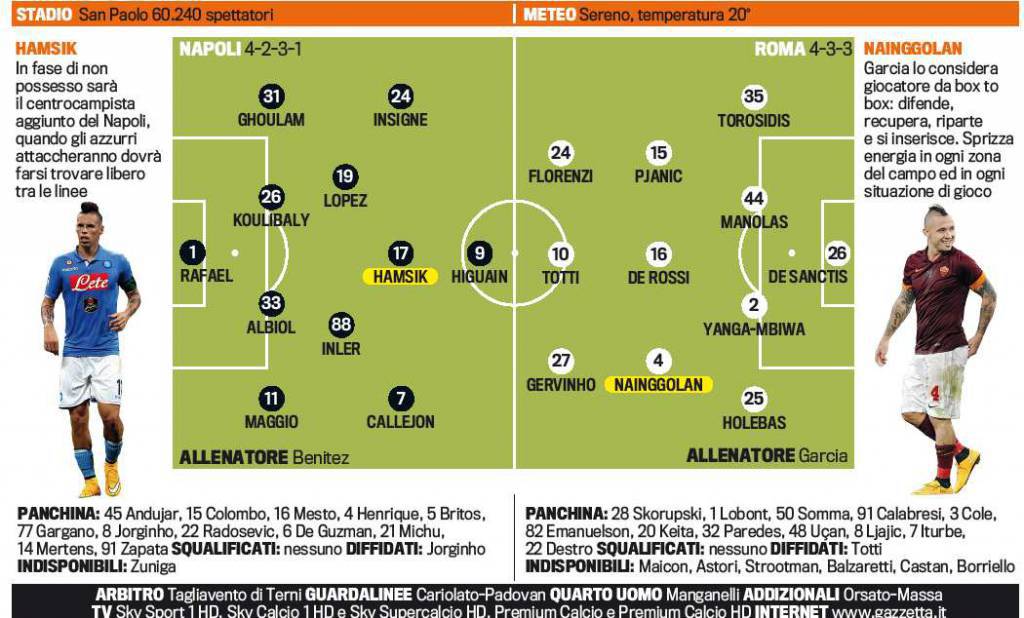 E’ arrivato il giorno tanto atteso (e per certi versi temuto) dai tifosi di Napoli e Roma. Al San Paolo ore 18 ci sarà il grande incontro tra le due compagini, Benitez spera in una vittoria importante per rilanciare la squadra, Garcia vuole continuare a mettere pressione alla Juventus. Il tecnico del Napoli ripropone Hamsik al centro della linea dei trequartisti con Callejon a destra e Insigne a sinistra, in attacco Higuain. A centrocampo David Lopez e Inler dovranno aiutare la difesa, vero tallone d’Achille del Napoli. Garcia invece continua a puntare su Totti centravanti con Destro in panchina, Florenzi e Gervinho esterni d’attacco. Le probabili formazioni secondo la Gazzetta dello Sport.
