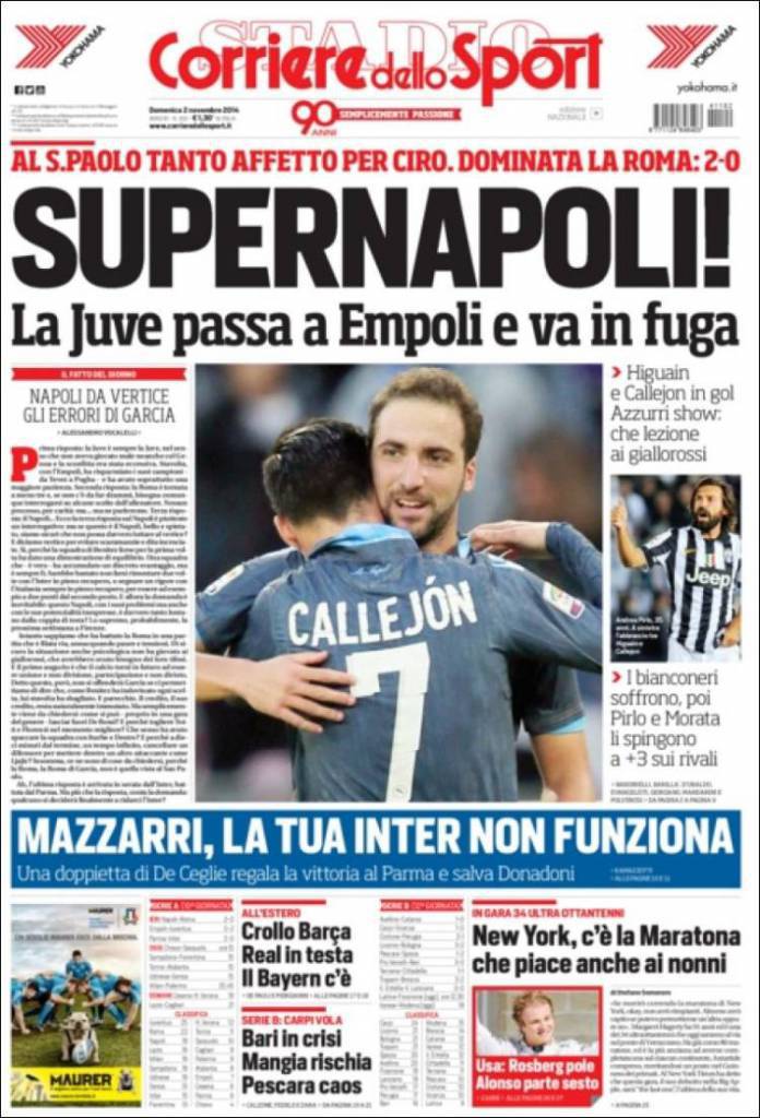 Al San Paolo il Napoli domina la Roma vincendo 2-0. Tanto affetto per Ciro. La Juventus passa a Empoli e va in fuga. Mazzarri, la tua Inter non funziona. Una doppietta di De Ceglie regala la vittoria al Parma e salva Donadoni. Crollo Barca, Real in testa. Il Bayern c’è.