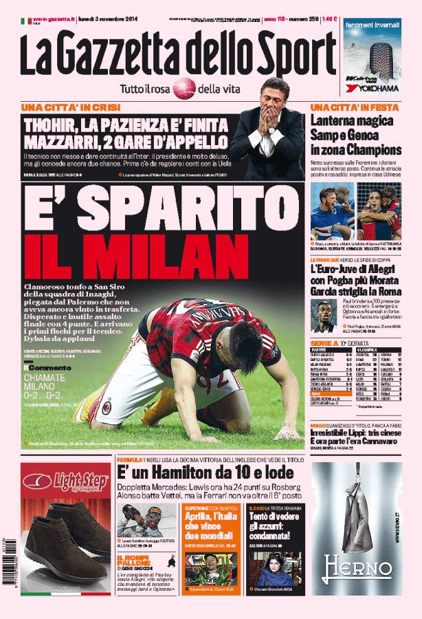 La Gazzetta dello Sport parla del Milan che perde due a zero in casa contro il Palermo di Iachini e riapre le polemiche nei confronti dei rossoneri.