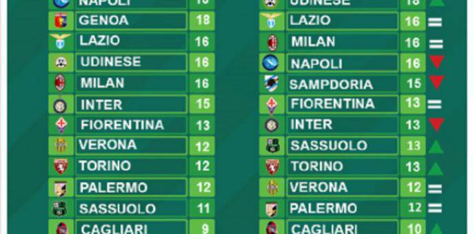 Controclassifica: Juventus 23 punti, Roma 21, Genoa 21, Udinese 18, Lazio* 16, Milan 16, Napoli 16, Sampdoria 15, Fiorentina 13, Inter 13, Sassuolo 13, Torino 13, Verona* 12, Palermo 12, Cagliari* 10, Atalanta 7, Empoli 7, Cesena* 6, Parma 6, Chievo 5.