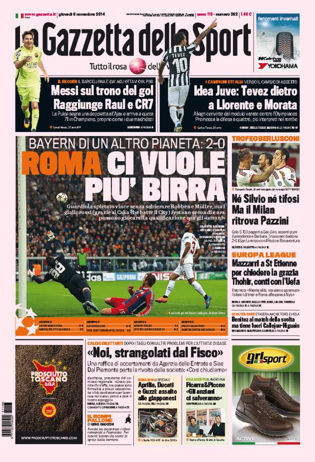La Gazzetta dello Sport parla della Roma che perde due a zero in Baviera contro il Bayern di Guardiola che è di un altro pianeta.
