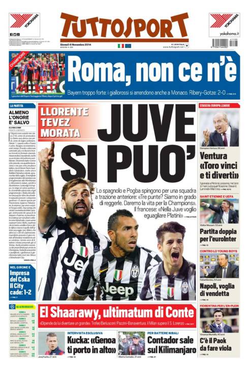 Su Tuttosport si parla del possibile utilizzo del tridente da parte di Allegri, ovvero Morata-Llorente-Tevez.