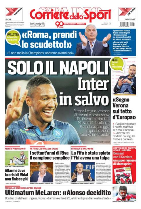 Il Corriere dello Sport parla della vittoria del Napoli con la tripletta di De Guzman, mentre Inter e Fiorentina pareggiano, sconfitta per il Torino.