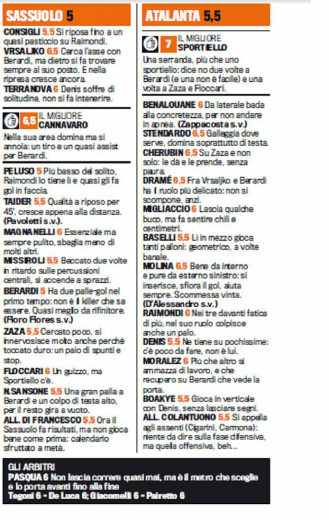 Finisce 0-0 il primo anticipo dell’undicesima giornata di serie A tra Sassuolo e Atalanta. Un match giocato a ritmi bassi e lenti in cui ha il predominio la noia. Nei voti della Gazzetta dello Sport, bocciate sia la formazione di Colantuono che quella di Di Francesco. Nel Sassuolo, il migliore è Paolo Cannavaro che domina nella sua area di rigore. Bene anche Vrsaljko, bravo a farsi trovare sempre al suo posto. Nell’Atalanta, invece, il migliore è Sportiello, una serranda che dice due volte no a Berardi e una volta a Zaza e a Floccari.