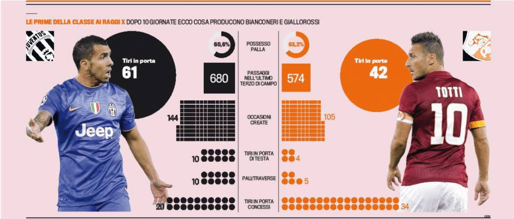 A fornirci tutti i dati per eleggere la squadra migliore della serie A dopo dieci giornate è l’edizione odierna della Gazzetta dello Sport che analizza i vari elementi delle due formazioni. Il quotidiano sportivo prende in esame possesso palle, passaggi nell’ultimo terzo di campo, occasioni create, tiri in porta di testa, pali/traverse e tiri in porta concessi. In tutti, la squadra di Massimiliano Allegri è nettamente in vantaggio. Per i bianconeri, infatti, la Gazzetta conta 144 occasioni da gol e porta centrate ben 61 volte. 19 volte in più rispetto ai giallorossi. Dall’altra parte, Rudi Garcia è il mago del possesso palla ma la sua squadra deve crescere ancora e soprattutto creare di più.