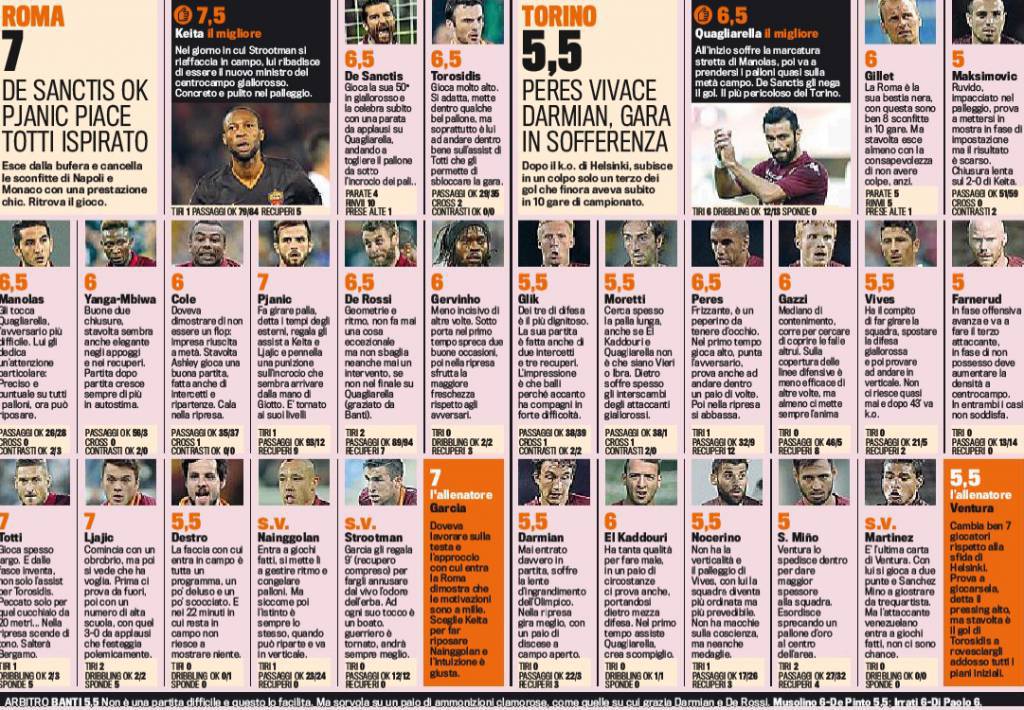 Nel giorno in cui la Roma riassapora Kevin Strootman in campo, Seydou Keita sale in cattedra e decide di dare vita ad un match strepitoso con tanto di gol. Il centrocampista ivoriano è il migliore della Roma che batte tre a zero il Torino di Ventura: bene anche gli attaccanti da Totti a Ljajic che però polemizza con i tifosi. Male Destro entrato con poca voglia in campo. Nel Torino invece il migliore in campo è stato Fabio Quagliarella che non si è arreso mai nonostante la marcatura asfissiante di Manolas. Voti e pagelle della Gazzetta dello Sport.