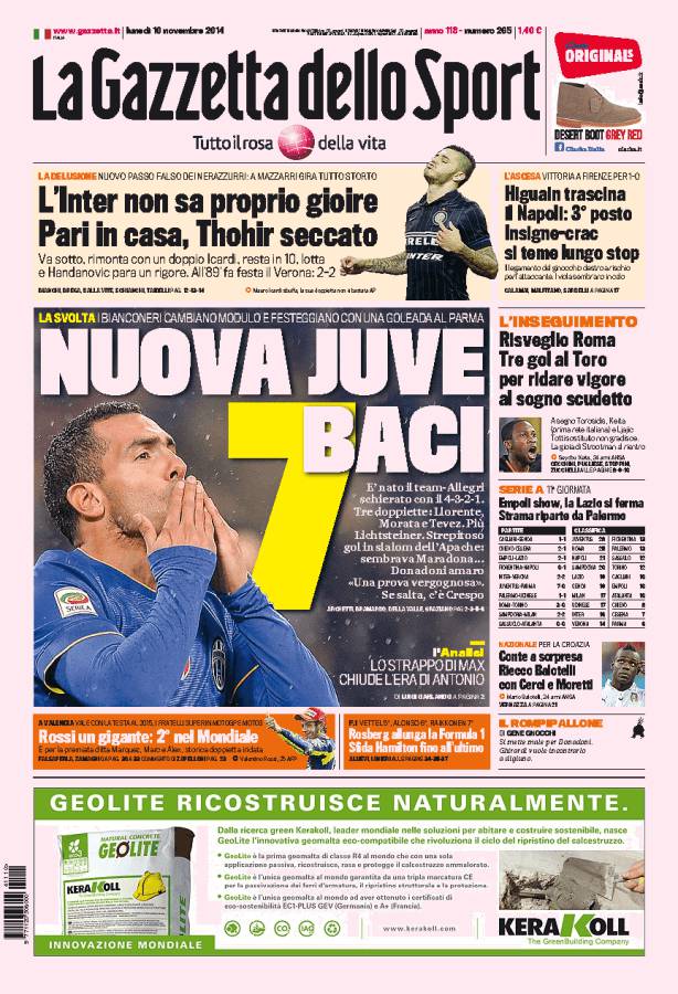 La Gazzetta dello Sport parla della Juventus che ha battuto il Parma sette a zero anche grazie al nuovo modulo disegnato dal tecnico toscano.