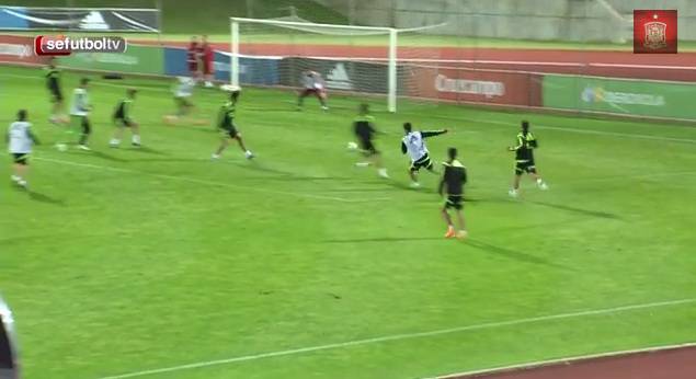 Gli allenamenti della Spagna sono sempre uno spettacolo anche perché i giocatori convocati hanno un tasso qualitativo notevole. Così durante un match di allenamento capita di vedere giocate importanti. In questa occasione le giocate importanti sono due: la prima è quella di Juanfran che supera un avversario con un tunnel e vola via sulla fascia destra, il cross in mezzo viene sbattuto in rete da Paco Alcacer, classe ’93, gioiello del Valencia, con un favoloso colpo di tacco. Il pubblico ovviamente rimane meravigliato da tanta classe da parte dei giocatori iberici.