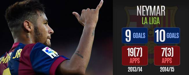 Attualmente Neymar è il secondo marcatore più prolifico della Liga alle spalle dell’irraggiungibile Cristiano Ronaldo: il portoghese guida la classifica dei gol con 18 reti mentre il brasiliano segue con 10 (3 in più del compagno di squadra Messi). Un bottino davvero niente male visto che è stato conseguito in appena 10 presenze su 11 gare complessive. La scorsa stagione Neymar siglò la miseria di 9 reti in 26 presenze. Il brasiliano oggi è più concreto e meno lezioso; il Mondiale brasiliano lo ha fatto maturare per la gioia di Luis Enrique che può oggi affidarsi al talento dell’ex Santos oltre al genio di Messi. Il Barcellona gongola.